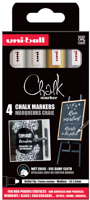 blanc, pointe ogive, largeur de tracé: 1,7 mm à 2,5 mm,, utilisable intérieur et extérieur, s'efface avec un chiffon, humide, résiste à la pluie, pointe en polyester, contenu : 4 pièces, (PWE5M/4 PF BL)
