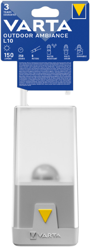 design rectangulaire, LED haute performance, logo VARTA en, relief éclairé, fonction d'atténuation, minuterie intégrée,, LEDs multicolores, fonctionnement sur piles (3x AA, non, fournies), protégé contre les projections d'eau et résistant, (16666101111)