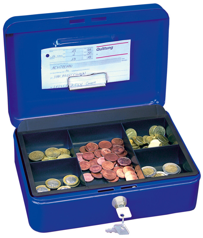 5 compartiments, Clip: sur la face interne du couvercle, pour coupons et billets, en acier, couche résistante aux, égratignures, poignée de transport rabattable, avec compar-, timents en plastique pour pièces de monnaie, serrure cylin-, drique avec 2 clés (145.303H)
