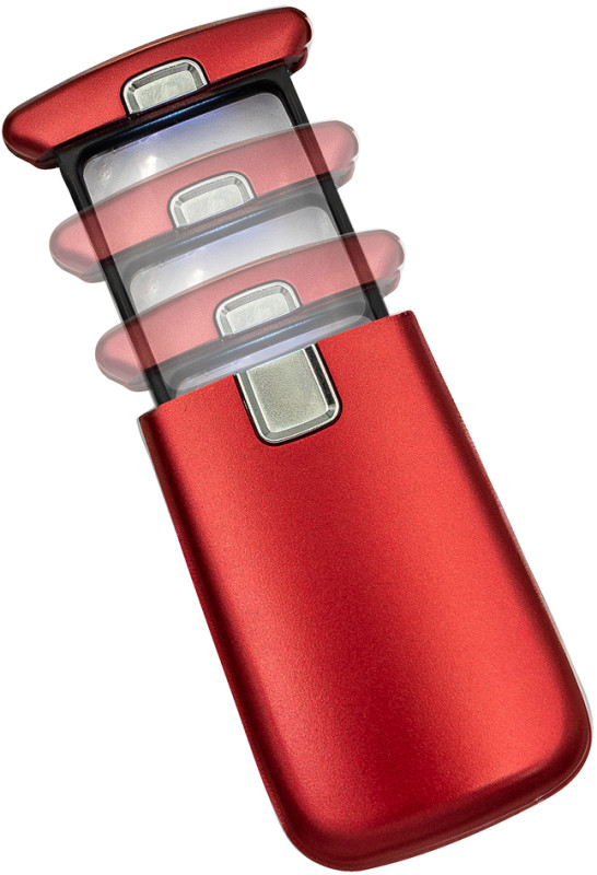 Vergrößerung: 3-fach, metallisch schimmernde Gehäusefarben,, mattierte Kunststoffoberfläche, Schiebemechanismus (Linsen-, schutz), Kunststofflinse, inkl. 2x 3V CR1220 Batterien,, Maße: (B)58 x (T)16 x (H)98 mm, (2717703)