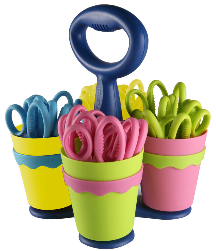 Ständer: aus Kunststoff, Tragegriff, 4 entnehmbare Becher,, Schere: rund, mit farbigen Kunststoffgriffen, Länge: 130 mm,, mit antibakteriellem MICROBAN-Schutz,, beinhaltet: 24 Scheren, (14756)