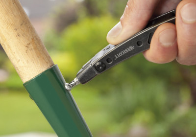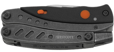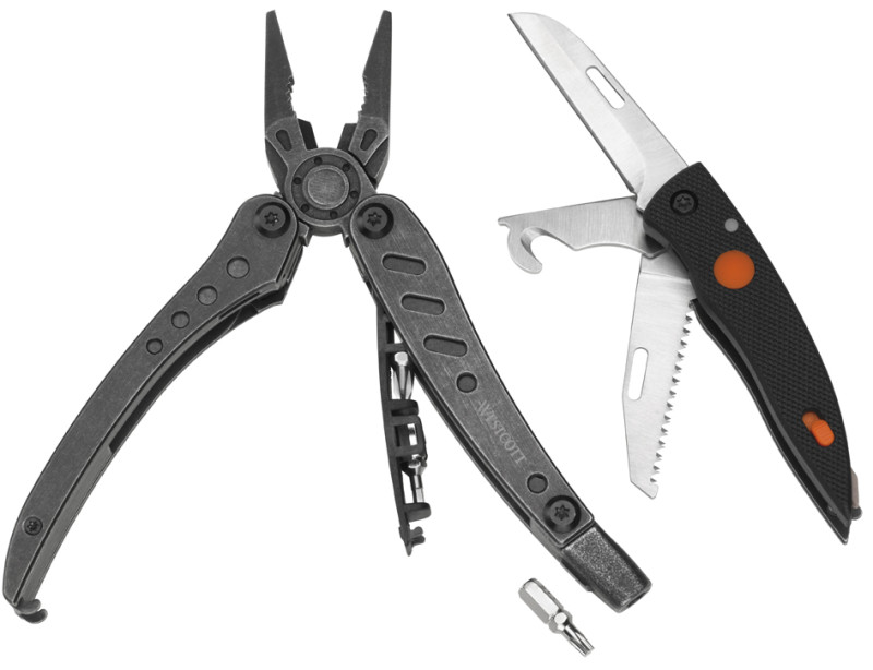 outils multi-fonction en acier inox, manche en acier inox, et ABS, lampe LED intégrée, rechargeable, pince universelle, + couteau de poche amovible (scie, couteau, décapsuleur/, ouvre-boîte), porte-embouts avec 4 embouts, sacoche en nylon, (E-84035 00)