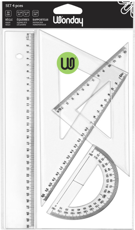 en plastique, graduation visible tous les 5 cm,, contenu: 1 x règle 300 mm, 1 x équerre 60 degrés 220 mm,, 1 x équerre 45 degrés 210mm, 1 x rapporteur 180 degrés 120mm, dans un pochette blister, (FTE040062)