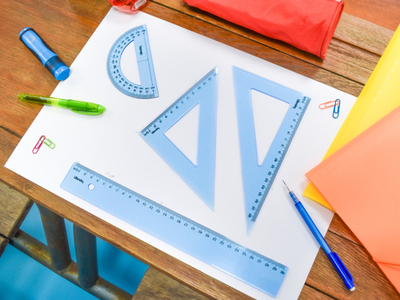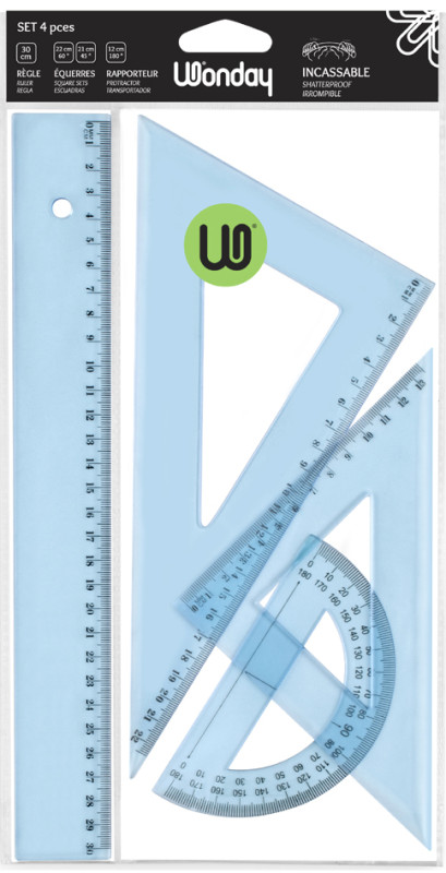 contenu: 1 règle 300 mm avec 1 biseau gradué en mm et bord, antitache, 2 équerres : 60 degrés, 210 mm / 45 degrés,210 mm, 1 rapporteur 180 degrés, 120 mm, en paquet de 12 pièces, (FTS040062)