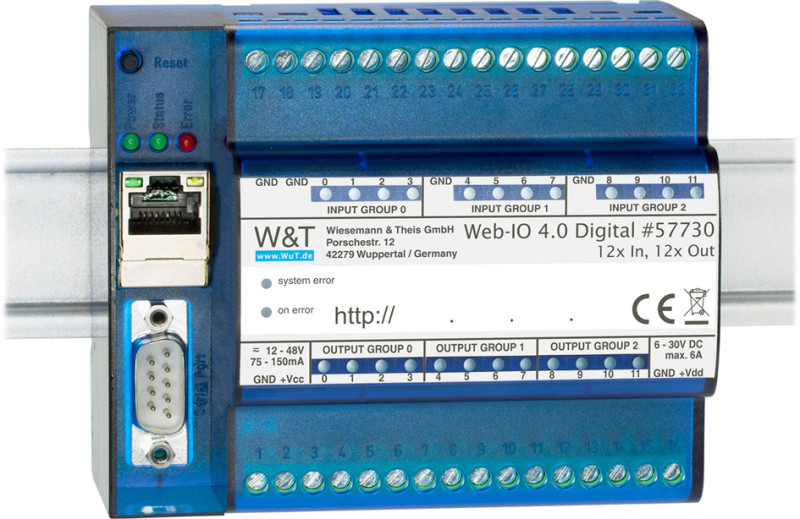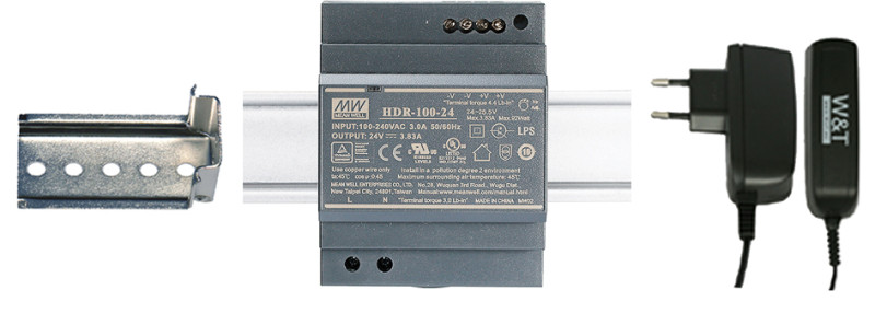 W&T Adaptateur secteur DC montage sur rail, 24V DC / 3,8 A pour tous les appareils 24 V de W & T, puissance utile 92W, tension d'entrée 85-246 V AC, protection contre court-circuits, 47 - 63 Hz, efficacité 90%, protection contre surtension, sortie courant 24 V DC, courant nominal 3,83 A, (11079) entrée 2 broches, sortie 4 broches avec borne à vis, refroidissement par convection, dimensions : (L)70 x (P)90 x (H)54,5 mm